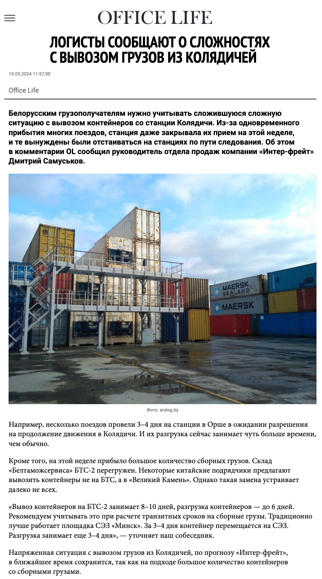 Потому даже при жесткой цензуре всего «государственного» появляются, хоть в очень осторожных выражениях, публикации, например, про задержки в получении грузов на станции Колядичи, составляющие 8-10 дней. Но к этому надо добавить и задержки до формального прибытия груза, пока его не подали на пути грузового терминала, в том числе из-за недостатка составителей. И это при том, что стандартами и правилами перевозок на операции по выдаче грузов предусмотрено до двух дней!