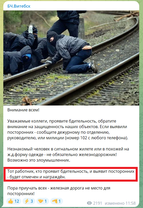 Таким образом на Витебском отделении пытаются бороться с возможными «диверсантами» и «провокаторами», подбирающимися к железнодорожному полотну.