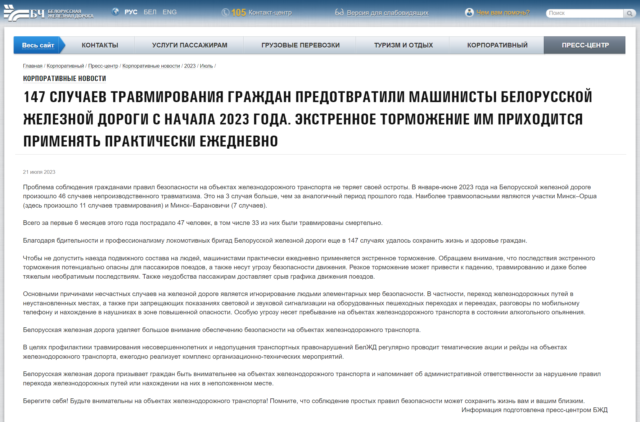 Нам сообщают, что в первом полугодии 2023 года предотвращено 147 случаев травмирования граждан железнодорожным подвижным составом. Замечательно. Однако, кроме этого, травмировано 47 человек, из которых 33 — смертельно. То есть в текущем году на каждый четвертый день один человек получил травму, а на каждый 5-6 день — погиб.